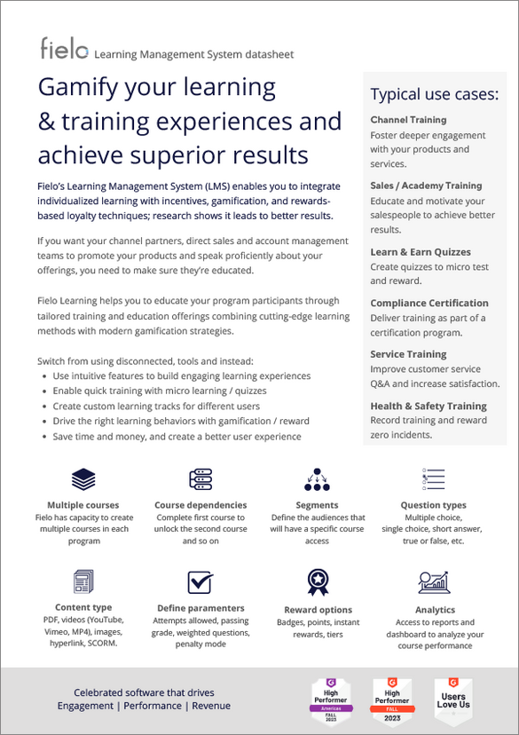 Download the datasheet to learn how Fielo’s Learning Management System (LMS) enables you to integrate individualized learning with incentives, gamification, and rewardsbased loyalty techniques; research shows it leads to better results.